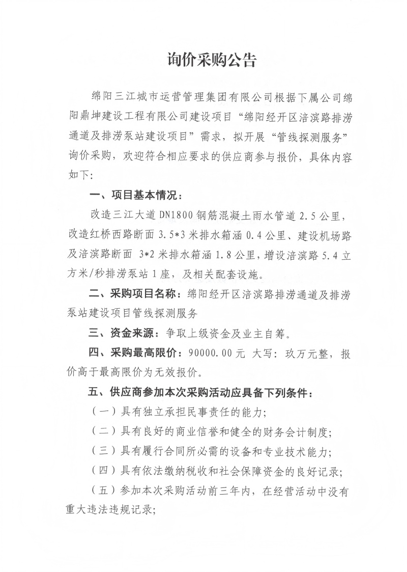 綿陽三江城營集團(tuán)涪濱路排澇通道及排澇泵站建設(shè)項(xiàng)目管線探測服務(wù)詢價(jià)采購公告